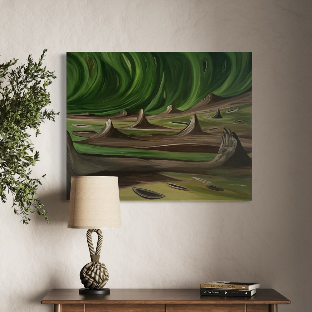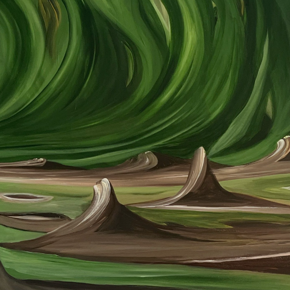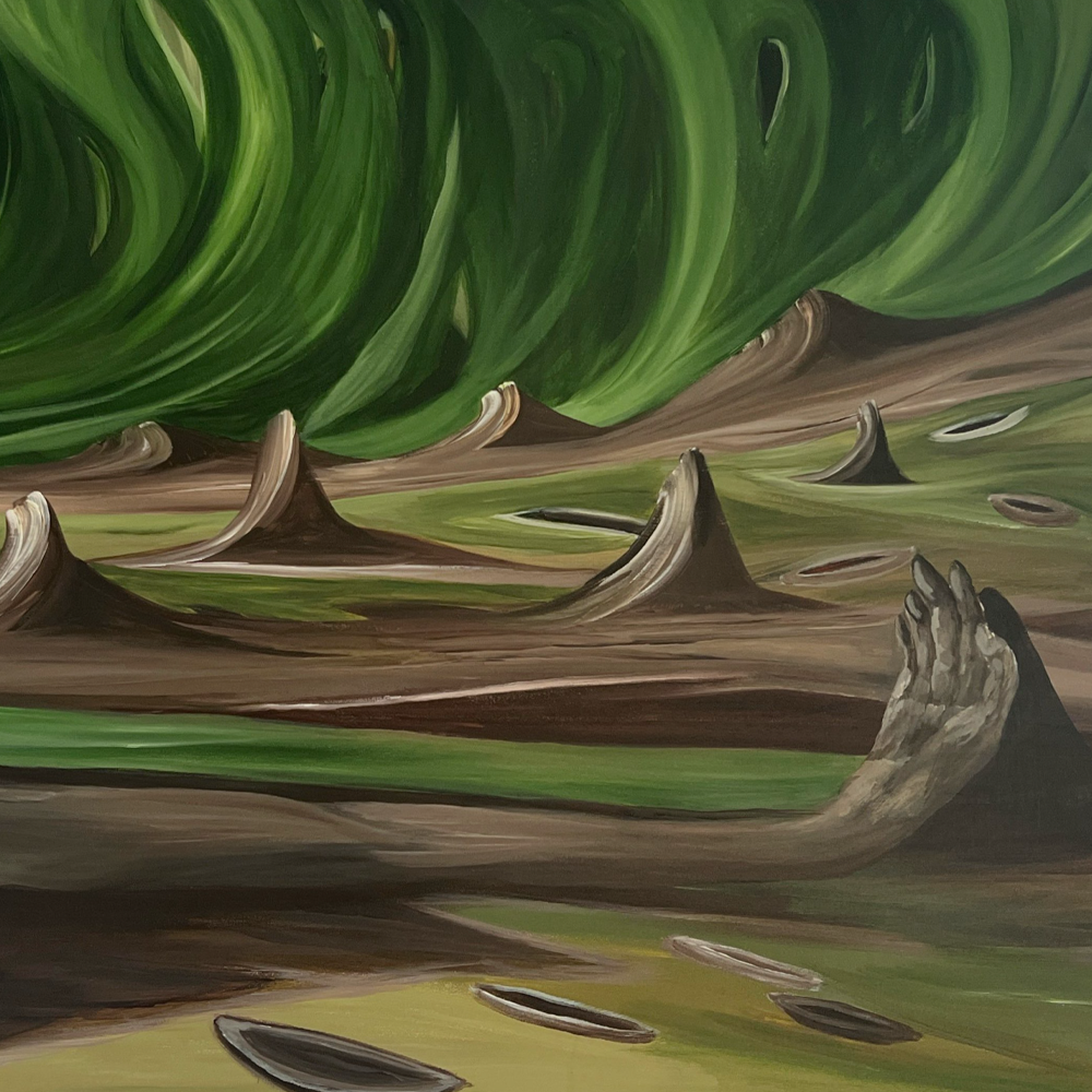 ובתוך ההתמסרות, איני מתנגדת עוד, גופי אינו שלי, הוא אדמה, הוא אבן, הוא זכרון. אצבעותיי הופכות לשורשים, שערי נסחף כטחב על פני המים, נשימתי הופכך לחרפת מעל האדמה הצחיחה. מה שחשבתי שהוא דממה, מתגלה כגלגול של יער שהיה, לוחש דרך שמים ירוקים. אני שוכבת כאילו דוממת, אבל האור עצמו מצא מקום בתוכי לנוח.