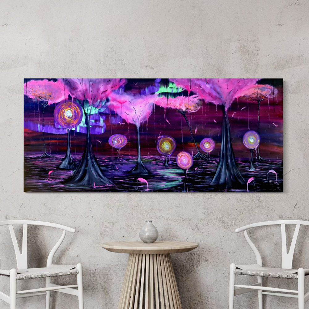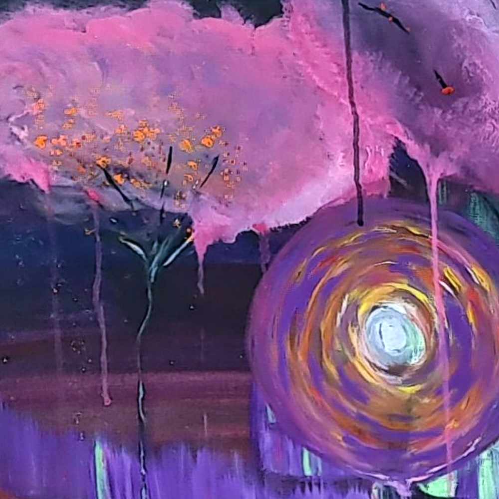 הציור הראשון שציירתי אחרי ה 7 לאוקטובר. אחרי הפסקה לא קצרה עבורי, פשוט כי לא יכולתי להרים מכחול במשך שבועות, ציירתי את נובה. יער אבסטרקטי שחור מלא בענני צמר גפן מתוק וסוכריות צבעוניות, פלמינגואים וכל אבוקת אור שיכולתי להכניס אל תוך כל החושך.