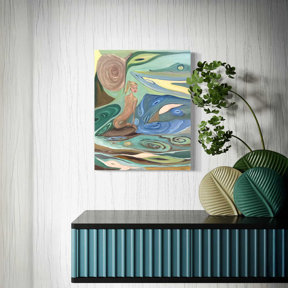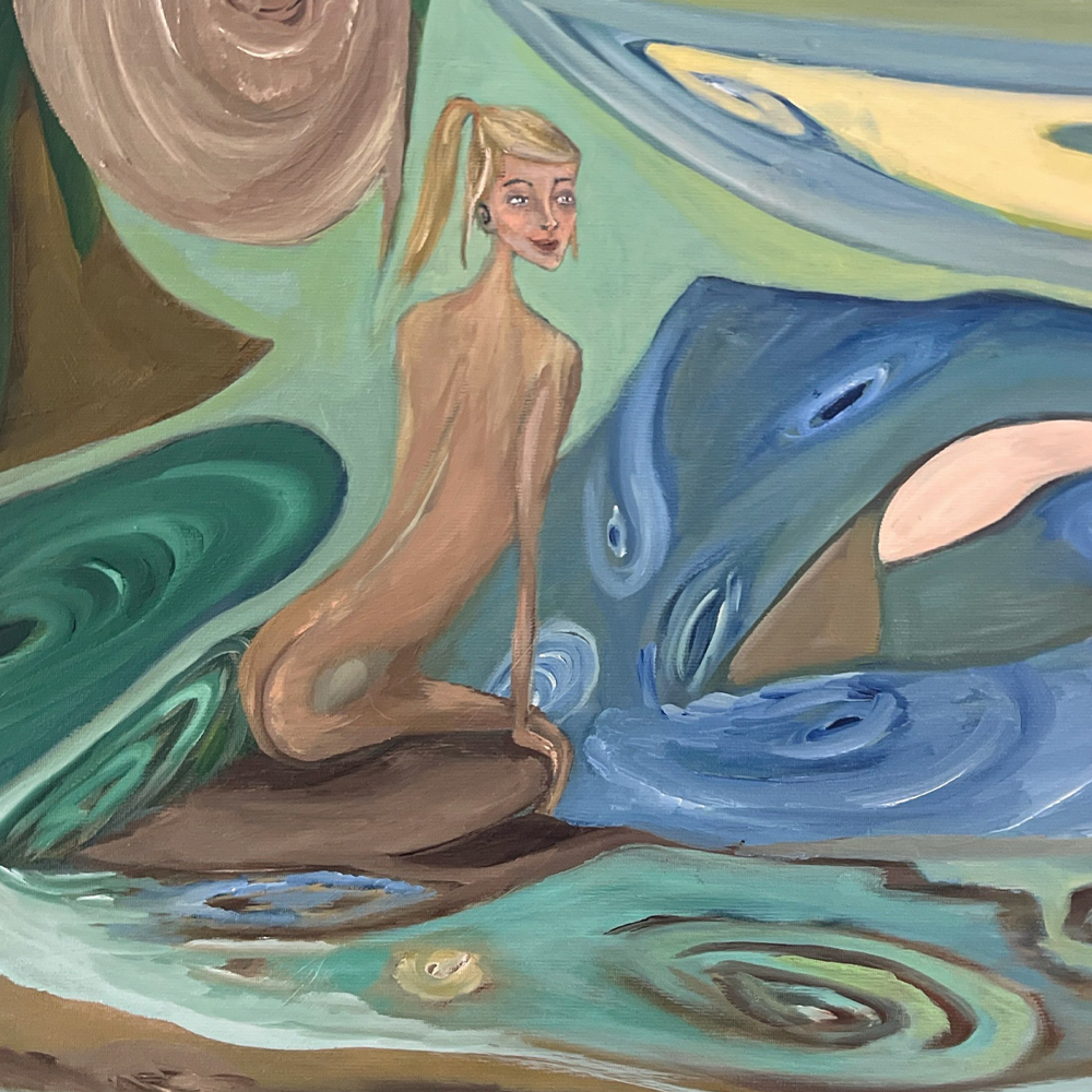 She sits watching her own mind — a whirlpool, a fountain, the sea itself. It rises and collapses, becomes cliffs and gators, snails and plants, water and light. Each thought turns into a creature; each breath, a wave. She is both the observer and the origin, the pulse beneath the surface where everything is connected, where nature and consciousness share the same tide.